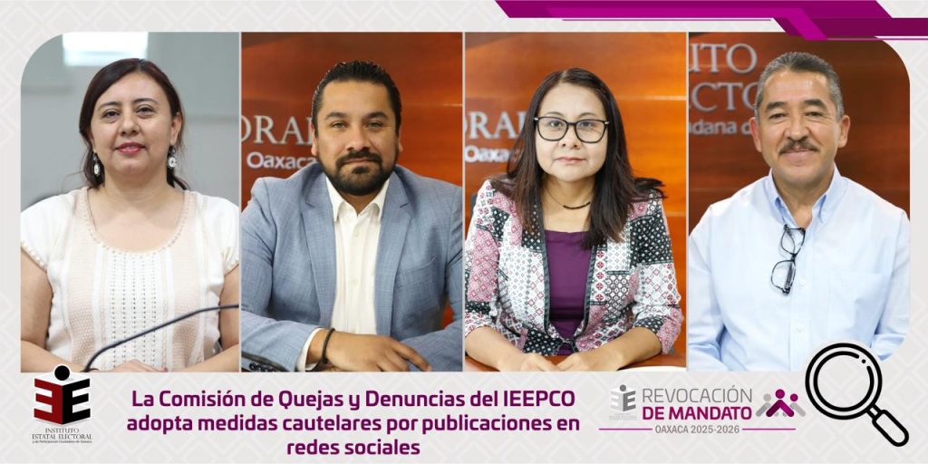 Este lunes, en sesión extraordinaria urgente, la Comisión de Quejas y Denuncias del Instituto Estatal Electoral y de Participación Ciudadana de Oaxaca (IEEPCO) aprobó un acuerdo para la adopción de medidas cautelares relacionadas con publicaciones en redes sociales, en el marco del Proceso de Revocación de Mandato, a celebrarse el próximo domingo 25 de enero.